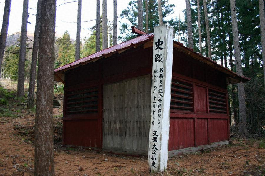 山地上にありて二箇所存す。一は字坂上にあり、昭和10年に発見せられ地下約3尺の處に位置す、河原石を以て略々楕圓形に敷き東西徑約4尺7寸南北徑約6尺4寸を有するものにして稍々中央に長さ約1尺3寸幅約1尺1寸深さ約6寸の石圍ひによる長方形の爐阯を存し南方約2尺3寸離れて甕形土器埋沒せり、一は字大久保にあり昭和12年の発見に係り地下約6尺の下に位置し河原石を以て東西徑約12尺6寸南北徑約10尺の楕圓形に敷き同じく中央に長方形の爐阯を具ふ、両遺構阯及附近より石器、縄文土器を出せり、山地に存する石器時代住居阯として顯著なるものとす。