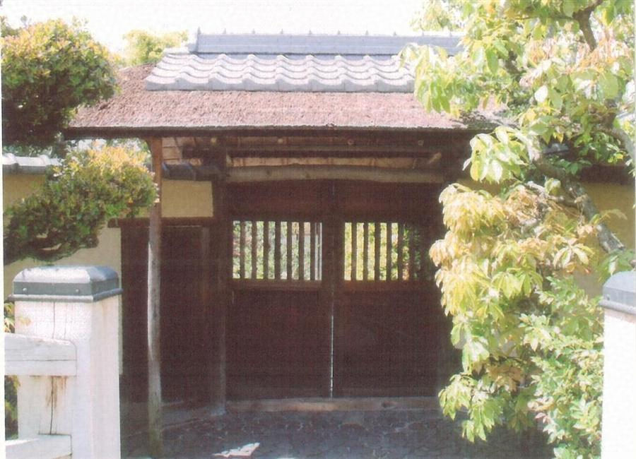 敷地の南東隅に位置し,太鼓橋の前方に東面して建つ。間口2.1mの腕木門で,切妻造,桟瓦葺とし,軒先や螻羽は檜皮葺とする。扉は縦連子を入れた両開戸で,楣は丸太材を用い,上部は吹放しとするなど,簡素ながら丁寧なつくりとし,表の構えを形成する。