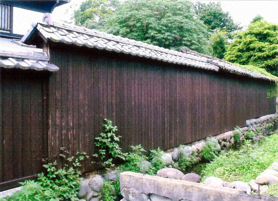 敷地の外周を画す塀で,敷地東面の水車小屋から南へ7.5m,敷地西面中央部に延長16mが残る。玉石積の石垣に切石を据えて土台を置く。高さ2.5mで,外側は縦羽目板張,内側は中塗仕上げで瓦屋根を載せる。良好に維持され,引き締まった外観を形成。