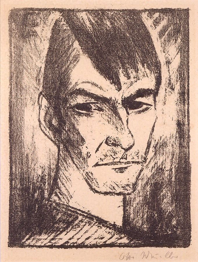 ドレスデン近郊の町で生まれたミュラーは、その芸術的出発点を石版画に求めた。生涯多くのリトグラフを残すが、大半はやせぎすの体の女性像を風景の中に配したものである。一九〇七年からベルリンに活動の場を移し、一〇年以降は表現主義運動の端緒であった「ブリュッケ」の活動に参加、本作が制作されたころには、ベルリンでの個展を終え、ブレスラウのアカデミーの教授となっていた。画面は太く単純化された輪郭線が特徴的で、素早くしかし的確にとらえられた形態は力強さを伝えている。また、わずかに右に向けられた顔と左へと流された視線は、造形的な工夫と同時に、ダンディズムさえ感じさせ、作者の人となりを伝えてくれる。自画像と言えば、制作時の何らかの「構え」が作品から伝わってくることが多いが、ミュラーの場合、それらはあまり声高に主張せず、彼の個性的な描線に消化されている。(生田ゆき)