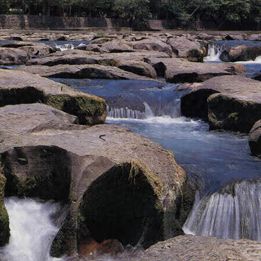 甌穴成生ノ種々ナル階段ヲ示スモノアリテ玻璃質霧島熔岩ノ上ヲ流ルヽ溝口川ノ河床ニ生ジ長サ約五百米ノ間ニ其ノ数千ヲ算スルヲ得ヘシ斯クノ如ク一個處ニ多数ノ甌穴ノ群集スルハ他ニ其ノ類例ヲ見ズ 浸蝕ニ関スル現象ノ天然紀念物トシテ最モ顕著ナルモノナリ