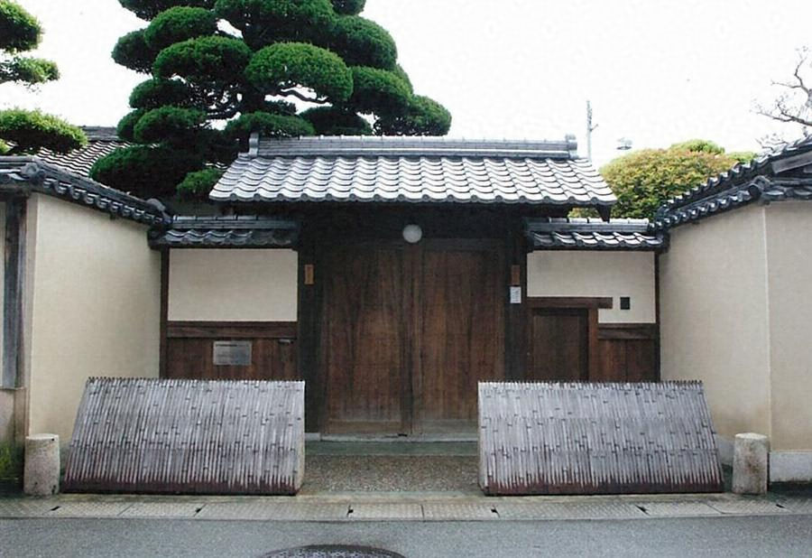 敷地北辺、通りから入った位置に北面して建つ一間棟門。緩い起りのある切妻造桟瓦葺で、一軒疎垂木。五平柱を楣で固め、両開板戸を吊る。両側の袖塀は、腰板張の土壁仕上げ、桟瓦葺とし、西側には潜りを開ける。落ち着きのある表構えをつくる。