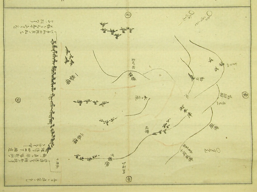 長州藩(萩藩)が羽賀台で行った軍事演習の関係記録。「御旗本陣取幕囲之図」では、陣幕で囲まれた藩主の「御旗」を中心として左右に隊士を配した陣形を表している。また、別添の羽賀台の略図によれば、東南に「御本陣」が置かれ、東側寄りに「右備」、南側寄りに「左備」、「御本陣」の前後に「前備」「殿備」を置いた様子がわかる。なおこれらの図面のほかに陣中規則などの記録類も収められている。