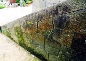 敷地東側の石畳道路から前門までの14段の石段。石段幅は前門の間口に対応した2.1mで,踏石には幅40cm,厚15cm程度の板石,側石には15cm角程度の長石を用い,石段北面は亀甲積に近い丁寧な石積面を見せる。