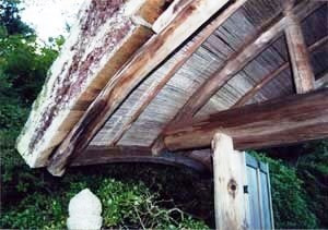 庭園の内外郭を区切る位置に建つ門。親柱,控柱,冠木で軸部を構成し,その上に大きく弓形に曲げた垂木を配して迫持状の檜皮葺屋根を載せる。間口約1.7mの小規模な門だが,丸太や名栗の部材を多用した数寄屋風の意匠で,奇巧性に富んだ特異な形式になる。