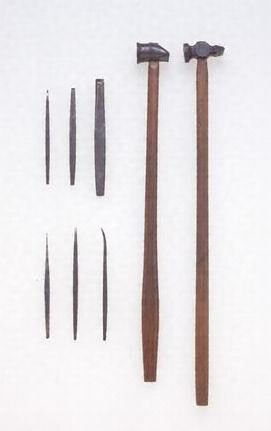 鉄 鍛造 竹 鏨52点(ならし11 滑刳14 毛彫8 丸毛彫5 片切8 定鏨3 布目2 魚々子1) 突鐫3点 鉄篦3点 生下15点 竹篦20点 鉄鎚2点