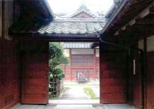主屋の土間側南西角と道具部屋の南東角を結んで設けた通用門。前庭と裏庭を区画する。切妻造,桟瓦葺で,主屋の庇下に棟を差入れる。中央に両開板扉を釣込み,両脇は塀とし,板扉上端部は木格子を組む。弁柄塗の木部と黄大津壁で周囲の建物と仕上げを揃える。