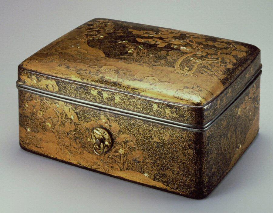 錫の置口を付けた合い口造りの箱で、身に金銅三ツ千鳥透金具、鍍銀鏡板、鐶台切子に栗形。紐金具を打ち、内に懸子を納める。蓋表は梨地、研出高蒔絵に螺鈿を交えて流れに土坡、秋草、松に千鳥を図し、「秋」「高」「伏」「冷」などの文字を配し、側面は風になびく秋草、松に千鳥を描き、「風」「柏」「池」「無」などの文字を散らす。蓋裏は研出蒔絵で、土坡に松、秋草、千鳥、懸子は見込、側面内外に秋草を描く。身の内側に赤字切り小花紋錦を貼る。