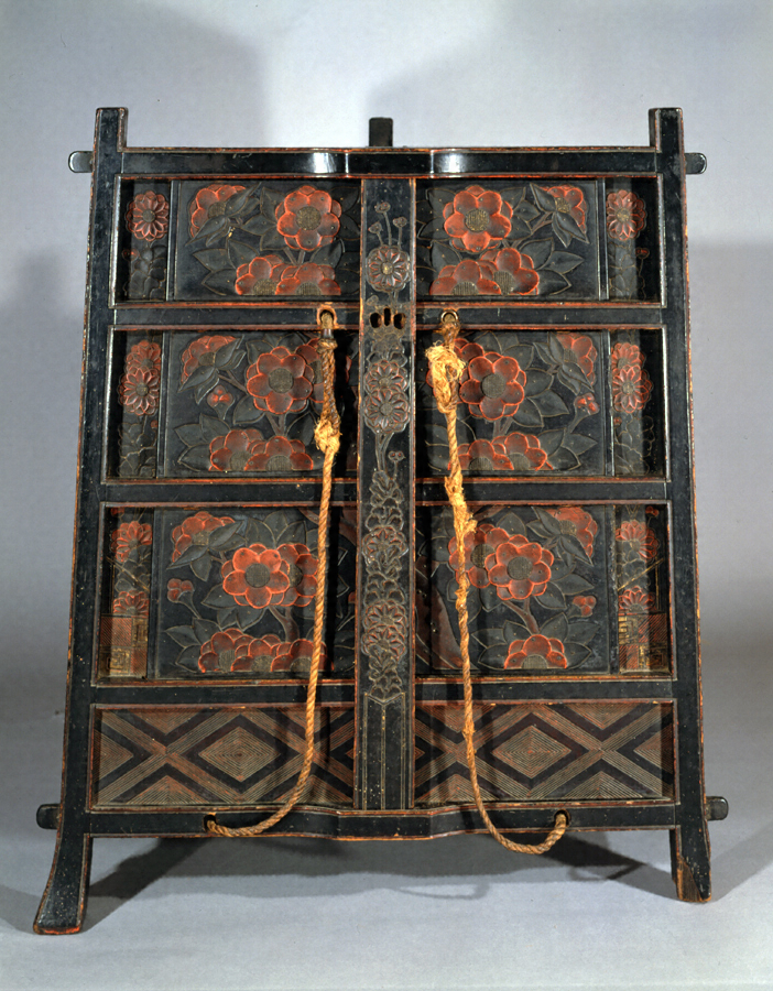 明代に流行した紅花緑葉式の、いわゆる鎌倉彫で装飾した室町時代の笈で、示現寺の笈とともに中国の彫漆器にみらぬ、独自の趣風を発揮している。作行・技法のすぐれた完好な笈の遺品である。