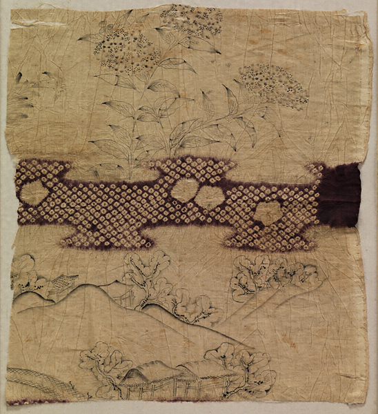 紫陽花と茅屋模様を表した辻が花裂。霞を鹿の子や丸文を含む絞り染めとし、紫陽花と茅屋のある山の風景を繊細な描絵で表わす。