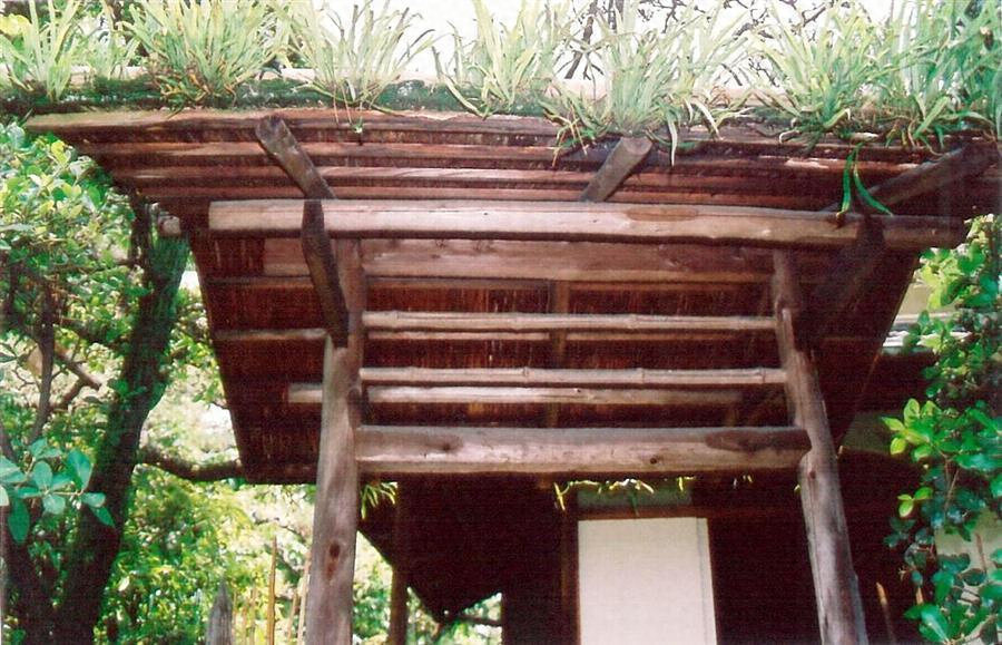 暁月亭の前面に建つ。棟門,杉皮葺。腕木で軒桁を受け,屋根は押え竹で杉皮を押え,棟には丸竹を伏せる。扉は竹簀戸を両開きに吊り込み,正統的な梅見門の形式とする。主屋前の庭園と茶室の間にある中門で,繊細な意匠とし,部材の接合などの技術に優れる。