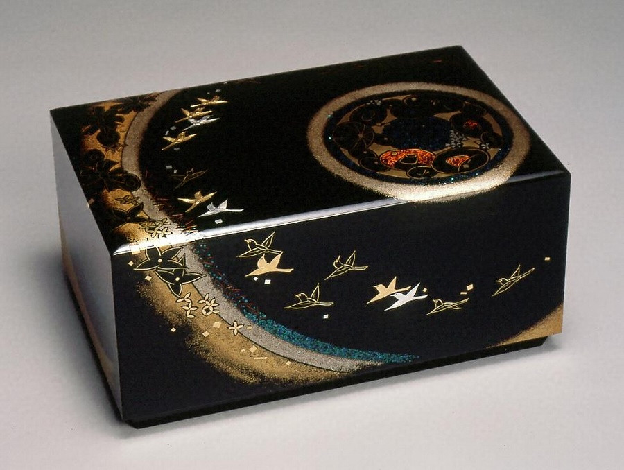 本作品には、金、銀の板や細い金線の平文で小鳥や花々が、金粉やみじん貝の蒔絵で太陽をイメージした光輪が描かれ、優美な理想世界が表現されている。平文(ひょうもん)は、金、銀などの金属板を文様の形に切り、漆地に嵌入するか又は貼り付ける技法である。平文を得意とし、蒔絵技法と効果的に組み合わせて用いる作者の特色がよく表れている。