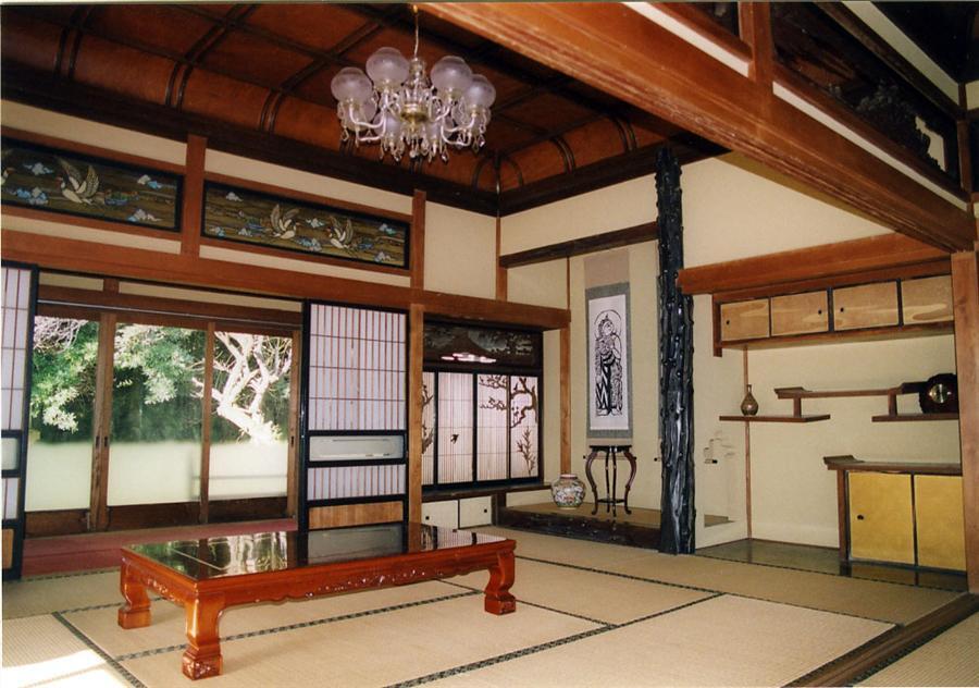 洋館の西側に建つ和館で、庭に南面して建つ。桁行6間、梁間5間で、緩い起りの入母屋造銅板葺屋根とする木造平屋建。10畳2室と6畳間からなり、正・側三方に縁廊下が廻る。座敷飾りや折上格天井、欄間のステンドグラスなど内部は凝った意匠になる。