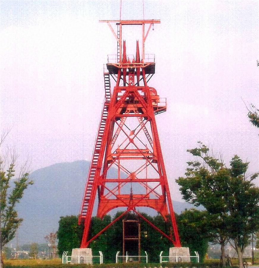 市のほぼ中心部に位置する旧鉱山施設。Ⅰ形鋼を用いた4本の鋼柱等からなる鋼構造体の頂部に、2基の大型ヘッドシーブを据え付けて総高28mとし、西側にはバックステイを添える。筑豊に残る唯一の鋼製櫓で、現存する明治期の竪坑櫓として最大級の規模を誇る。