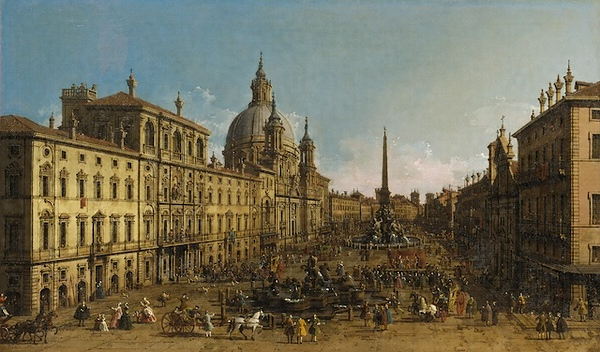 本作は、当時ローマの有名な観光地として知られていた2つの広場を対で描いた2作のうちの1点である。(もう一方の絵は「クィリナーレ宮殿の広場」を描いた作品で、同じく東京富士美術館の所蔵)ナヴォーナ広場は、古代ローマ時代に競技場を造ったのが始まりで、8世紀頃には広場となったようである。噴水を配した壮大な空間はバロック時代の「都市を一種の劇場と見なす」思考が窺えるが、広場では折しも街頭演劇の最中で、まさしく広場の「劇場性」を象徴するかのような多重の意味をもつ描写となっている。