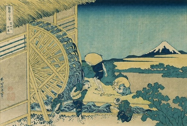 青山穏田村は現在の渋谷区原宿あたり。いたるところでこのような水車が見られるような田園地帯だった。水車による精米や製粉は人々の生活の糧であったという。背景に広がるのは水田(水錆田)で、田植えを待つ初夏の風景ではなかろうか。北斎は賑やかに働く人びとの動き、激しい水流によって反時計回りに大きく回る水車の円い形と、静寂な田園地帯にそびえる孤高の富士の形との対比を楽しんでいるかのようだ。水車を回し、流れ出た水の波の形は、右へ流れる勢いの強弱をも表現している。そう見るとき水の音まで聞こえてくる。北斎の観察力に驚くばかりである。亀を引き連れた稚児が驚くのはその水の動きか、はたまた富士の見事な姿であろうか。