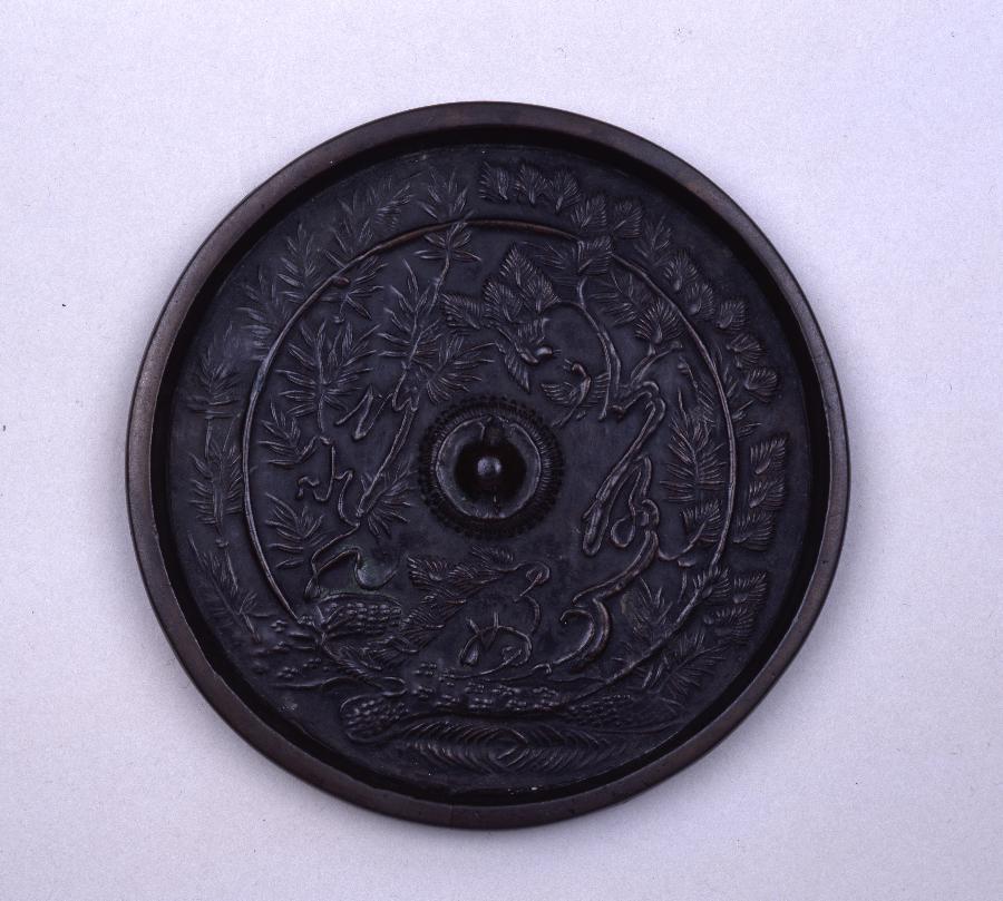 小形であるが鋳上がりがよい鏡である。本鏡の模様は、『拾遺和歌集』巻第五「賀」所収、斎宮内侍の「承平四年中宮の賀し侍りける屏風に」の歌、「色かへぬ松と竹との末のよを、いづれひさしと君のみぞ見む」を葦手絵にしたものと考えられる。中世を通じて流行した葦手絵が用いられた鏡は数少なく貴重である。