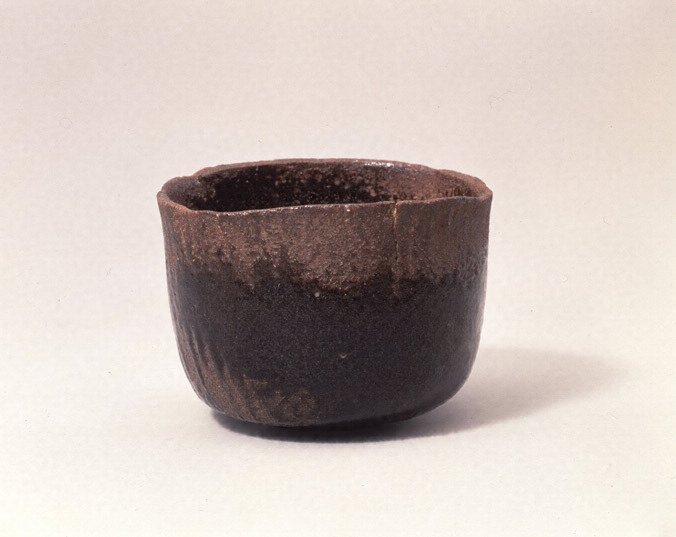 素地は鉄分の多いざんぐりとした陶質で、内外面に黒飴色の楽薬を塗り、塗り残した部分は黒褐色の素地を現している。器形は縁のわずかに反り、胴の切り立ちに近く、腰が丸く、小さい低い高台のついた碗形の茶碗。縁二箇所に窯割れがあり、畳付の釉は剥がれている。