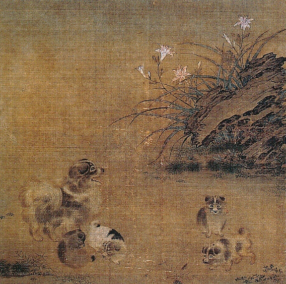 絹本著色萱草遊狗図〈(伝毛益筆)/〉