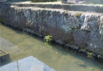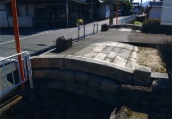 境内東辺に南北に水路が流れ、山門前には石橋が架かる。幅9.5m長さ2.9mの石造桁橋。上方に反らせた桁を9本架け、板石を並べる。下部に水繰を付ける高欄を両端に置く。石垣は安山岩を割石乱積とする。山門とともに伽藍正面を画し、風格を与える。