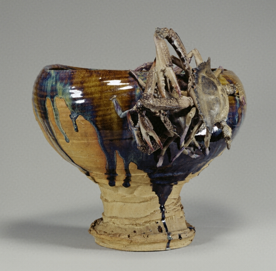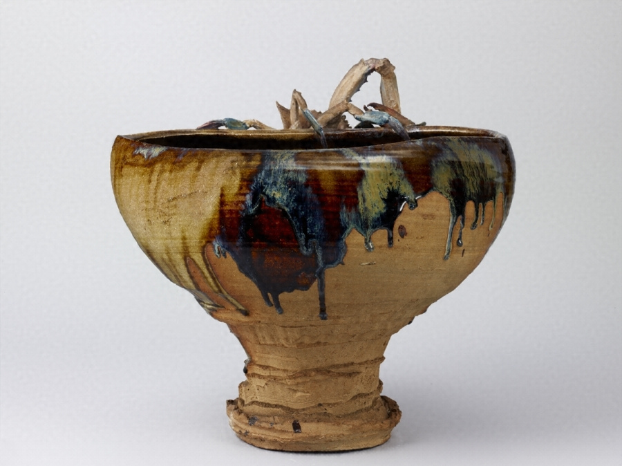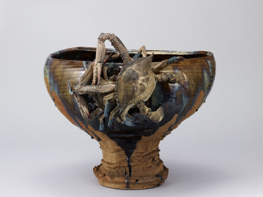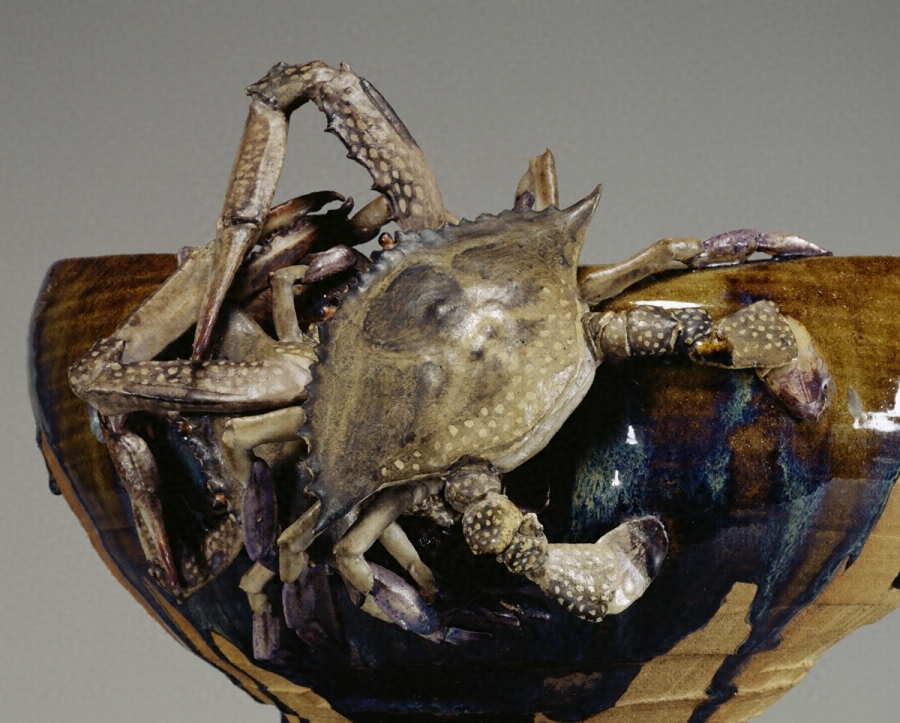 本台付鉢は、このような彫刻的な作品を創出した宮川香山の陶芸の一つの到達点を示す作品で、明治十四(一八八一)年第二回内国勧業博覧会出品作である。中世の焼締陶器を彷彿させる他に類例が知られていない大胆な変化を作り出した大振りで力強い鉢の正面に、大小二匹の渡り蟹がほとんど実物大で、甲羅や手足の斑紋、形態などきわめて忠実で写実的に表現されて貼り付けられる。全体に施された褐釉も見事に掛かり、藁灰釉も流れて変化ある釉景色を作り出している。