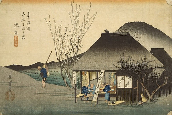 芭蕉の句「梅 若菜 丸子の宿のとろろ汁」と詠われた丸子宿の情景。横田山を背景に大きく詳細に描かれた茶店には「名ぶつ とろろ汁」と大きく書かれた看板が立てかけられ、「お茶漬け」、「酒さかな」の字も読める。店の中には、つるされたり巻き藁に刺さった魚や、干し柿も見える。茶店の藁葺き屋根に黒く止まるは烏の影か。この版は、後に「丸子」が「鞠子」と改題され再版されている。