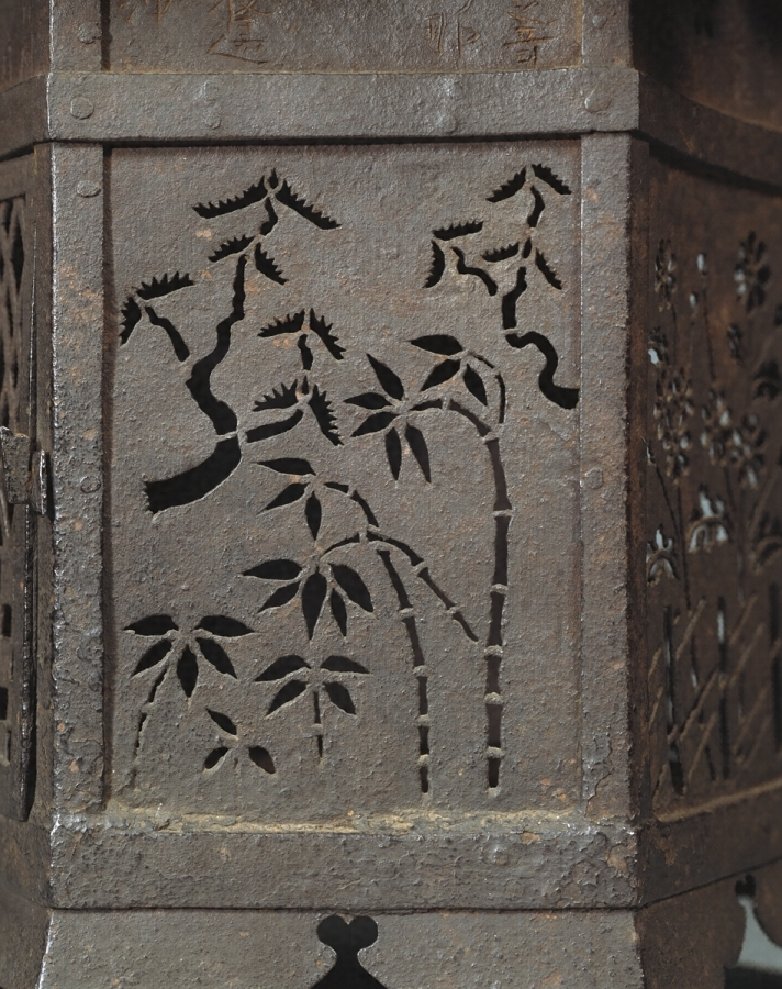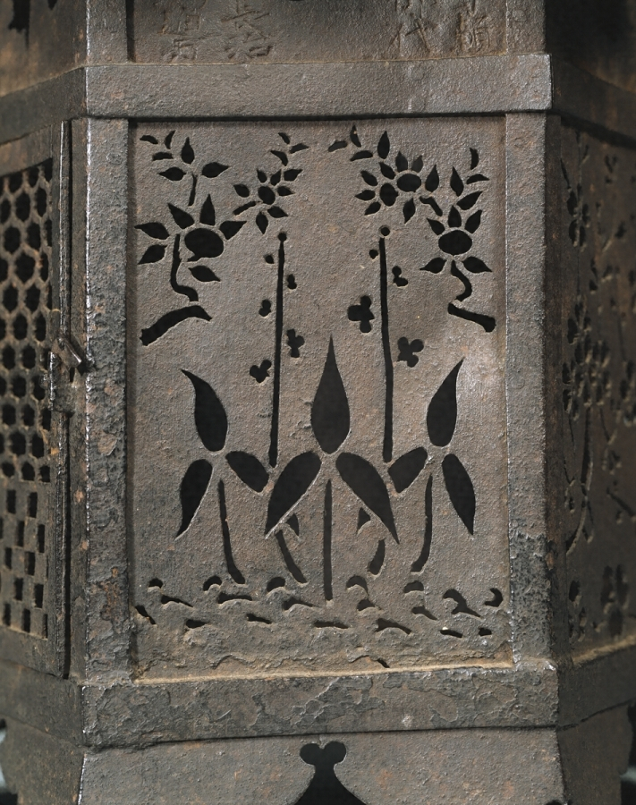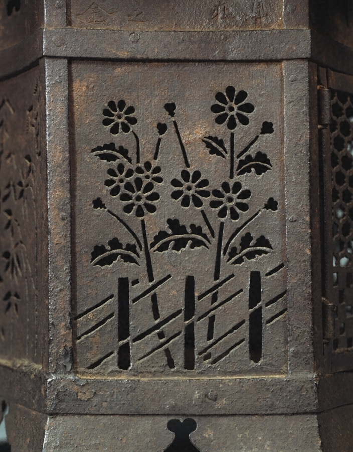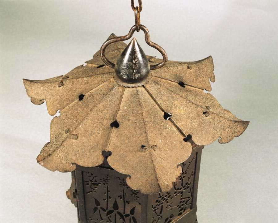 鉄板金製六角形の釣燈籠で、火袋【ひぶくろ】には二面の扉の他四面には菊籬【きくまがき】・松竹梅・橘などを陰透【かげずか】して光明の効果をもたらしている。その上の欄間には刻銘があり、永禄七年(一五六四)奥州会津の稲河之荘妙法寺に寄進されたことを示している。釣燈籠は古くは鋳銅製が多く、室町末期から銅板金製のものが多くなるが、鉄製の遺品は甚だ少ない。これは技法も精緻で、その作行も優れている。