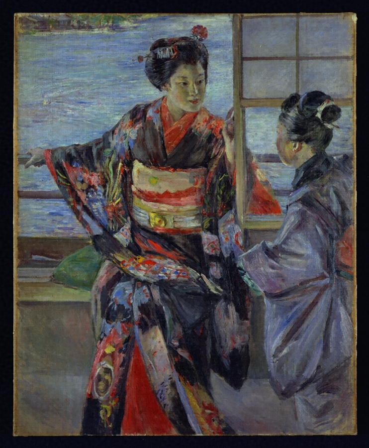 フランスより帰国した年、彼は初めて京都に遊んだが「舞妓」はそのすぐれた成果の一つである。エキゾティックな感覚の高まりで若々しい息づきとなって顕【あら】われているだけでなく、舞妓と小娘の呼応する構成や、鴨川の明るい流れを背景に人物を逆光の中でとらえた表現は新鮮な魅力をたたえているし、明るい明暗の諧調・鮮明な色彩の対比には彼の印象派的なすぐれた色彩感覚が発揮されている。「舞妓」はフランスで薫育された彼の才能がわが国の風土の中で最初に、しかももののみごとに結晶した作品といえよう。