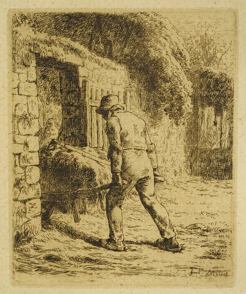 ミレーは、1847年頃、著名な版画家シャルル・ジャックとの出会いから版画を始める。ミレーは感動した題材を描くのに、油彩画だけで満足できずに、パステルやデッサン、そして版画など様々な技法で繰り返し試みている。この版画も1848年から1952年の間に同構図の油絵が描かれているが、デッサン、油絵、版画の三者を見比べると興味深いものがある。特にデッサンの肉太な輪郭線とエッチングのか細い針の跡との比較は、素材と技法に通じたミレーの熟練度の高さを示してくれるであろう。