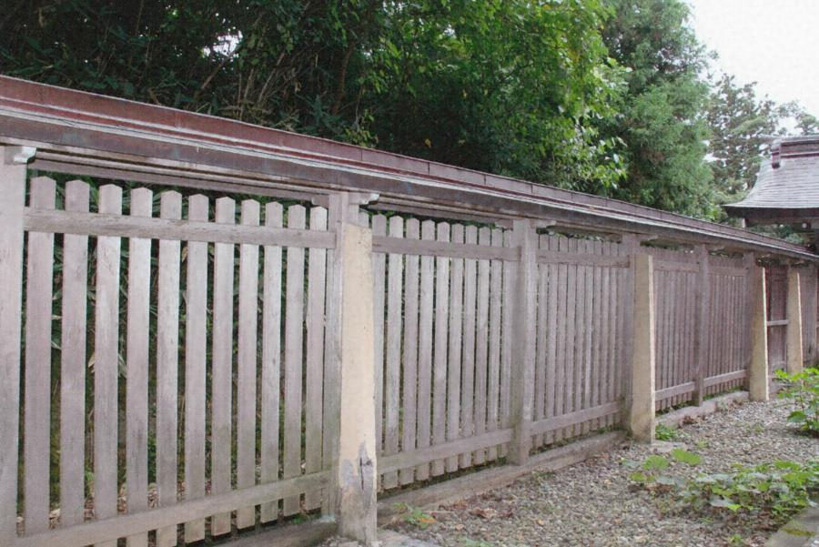 本殿と摂社月山神社本殿の側面と背面を総延長51メートルの玉垣が囲繞し、背面中央に後神門を構え、神域を区画する。門は一間腕木門で、切妻造銅板葺。角柱を貫で固め、舟肘木で受けた腕木で桁を持出し、一軒疎垂木を配る。両開戸を吊り、貫上に横連子を飾る。