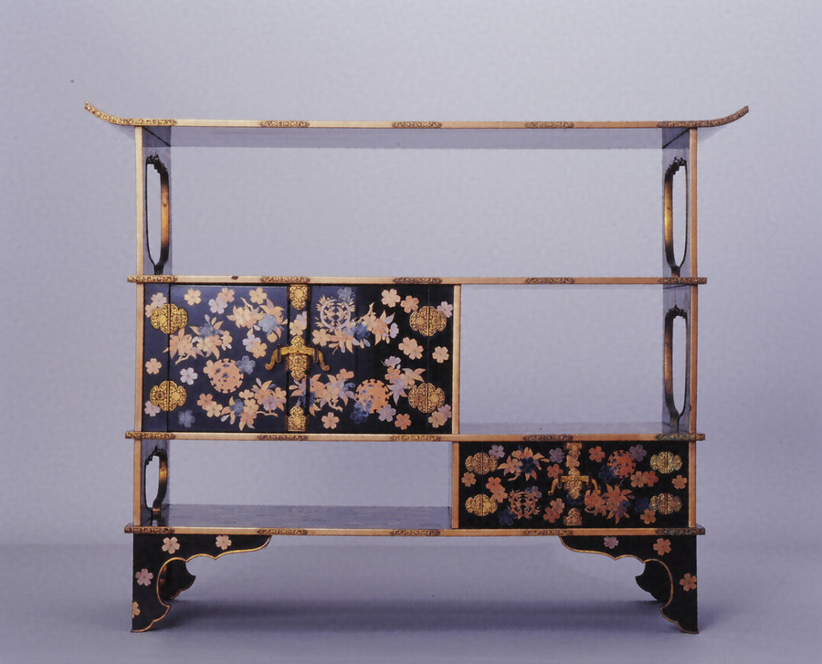 厨子棚とは、四段の棚と二箇所の局からなり、手箱や香道具・硯箱などを飾る棚のこと。黒棚・書棚とセットで三棚とされ、婚礼調度の中では格式の高い調度の一つである。黒漆塗の地に金・銀・青金・絵梨子地の平蒔絵で桜折枝と桜花文様を比較的密にあらわし、雪薄紋と竹に雀紋とを散らしている。局の扉裏の一つには松竹梅を、もう一つには松竹南天をあらわしている。金具は唐草に雪薄紋と竹に雀紋。これらの家紋は仙台藩伊達家の紋であることから、宝暦8年(1758)に7代藩主鍋島重茂に嫁した源姫(1739-1761)の婚礼調度の一つと考えられる。源姫は仙台藩伊達家6代藩主宗村女の惇子姫で、母は紀州徳川宗直女で8代将軍吉宗養女利根姫。