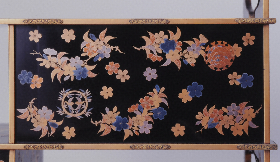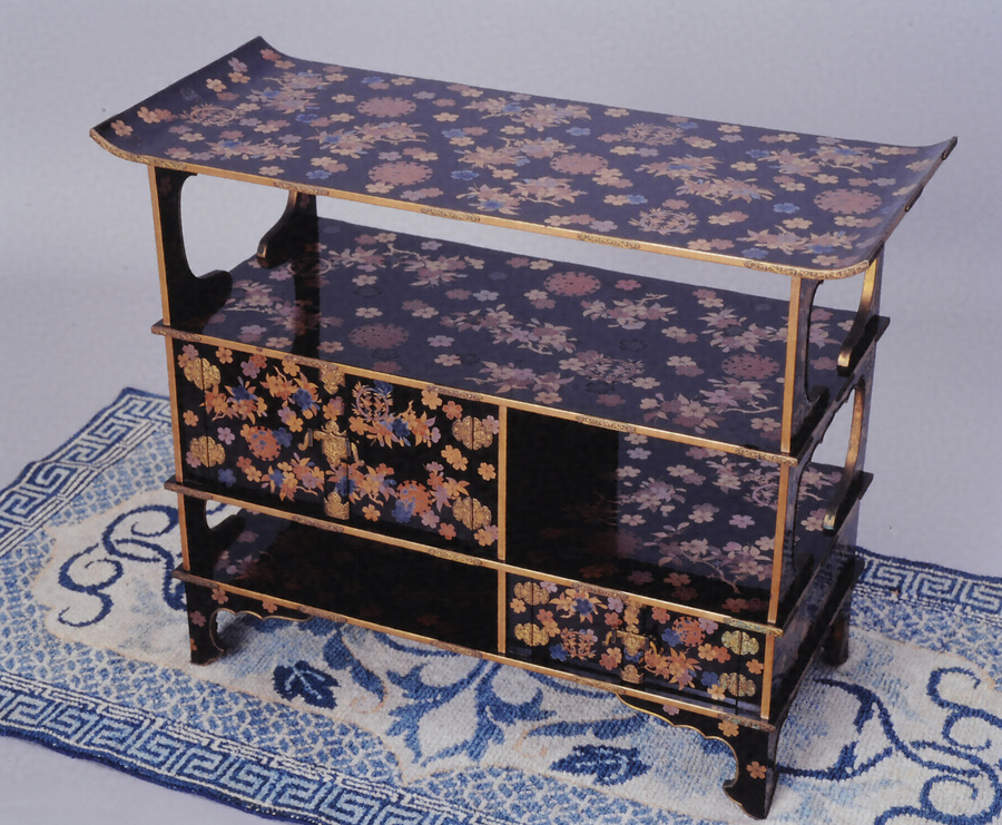 黒漆塗雪薄竹に雀紋桜枝散蒔絵厨子棚