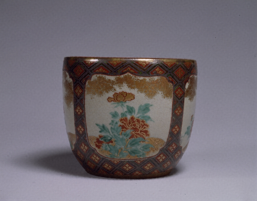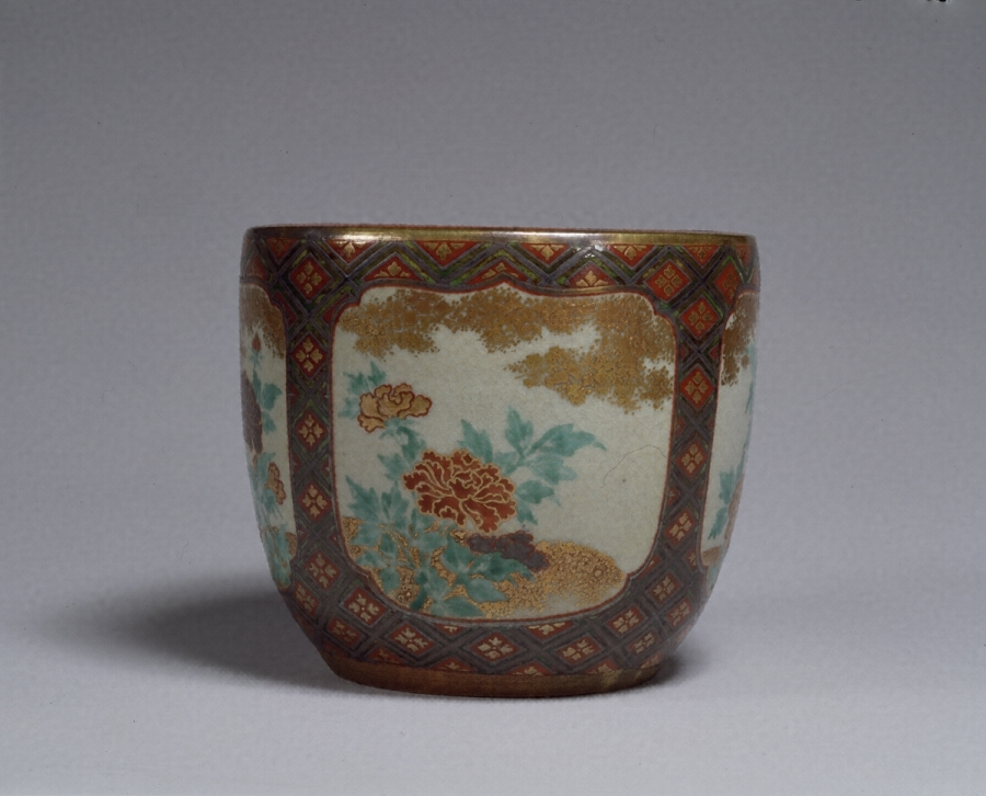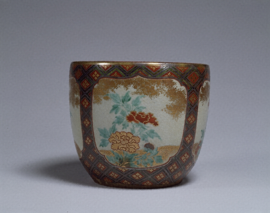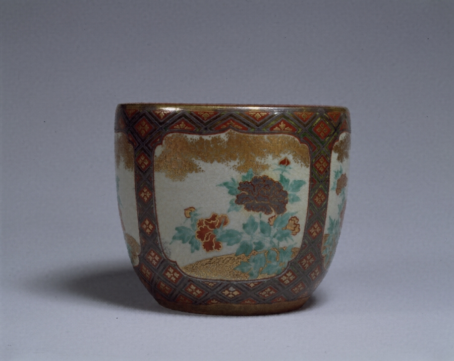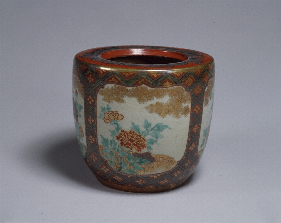 肩に稜をつけた棗形をなす轆轤成形の水指で仁清が創出した独特の器形である。器表には腰まで細かい貫入のある、なめらかな半失透の白釉を掛けて下地とし、そこに金・銀・赤・緑・黒で上絵付をきわめて入念になしている。中国陶磁の窓絵の構図に倣いながらも、文様は巧みに和様化され、胴の四方には格狭間形の窓に牡丹図を構図を変えて表現している。窓絵の土坡と霞を表した金泥は切箔のごとく表現され、地文様の花菱とともに蒔絵風の趣を生み出している。