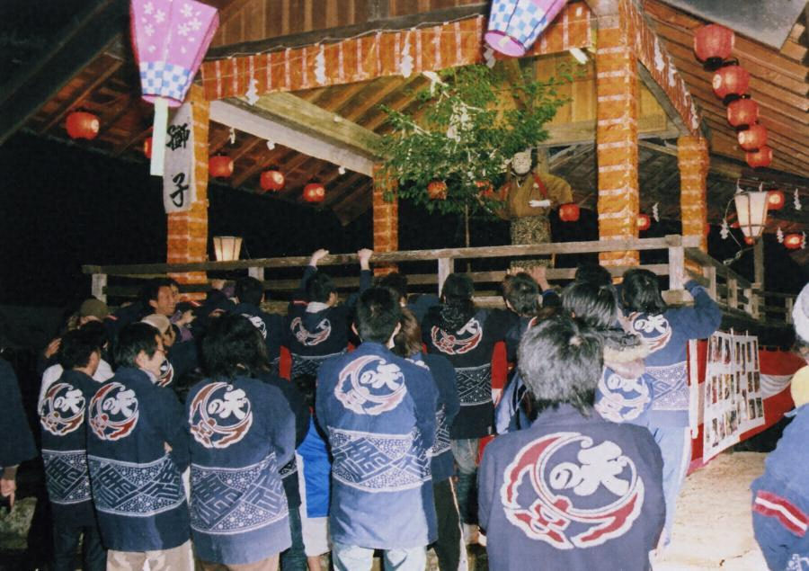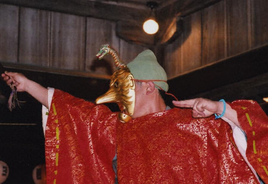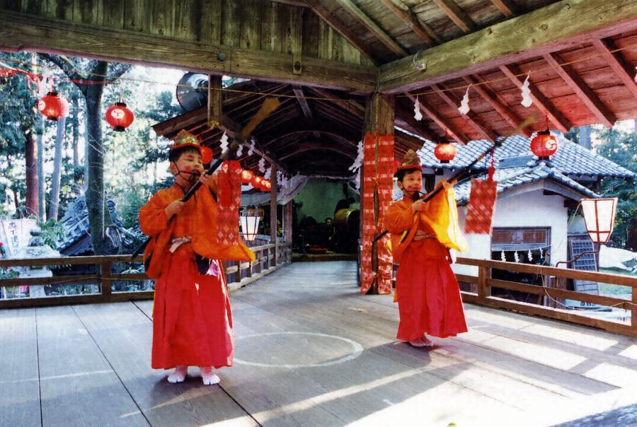 また、山名神社では「八初兒【やつはち】」「神子舞【みこまい】」「鶴【つる】」「獅子【しし】」「加陵鬚【かりようびん】」「竜【りよう】」「蟷螂【とうろう】」「優填獅子【うでんじし】」の八曲を伝えるが、この中には舞い手が鶴、竜、蟷螂【とうろう】などの作り物を頭にいただく風流の要素が強く、舞い手が柱に昇り逆になって上半身を煽ってみせる散楽【さんがく】風の要素もあるなど独特の演技、演出を見せる。