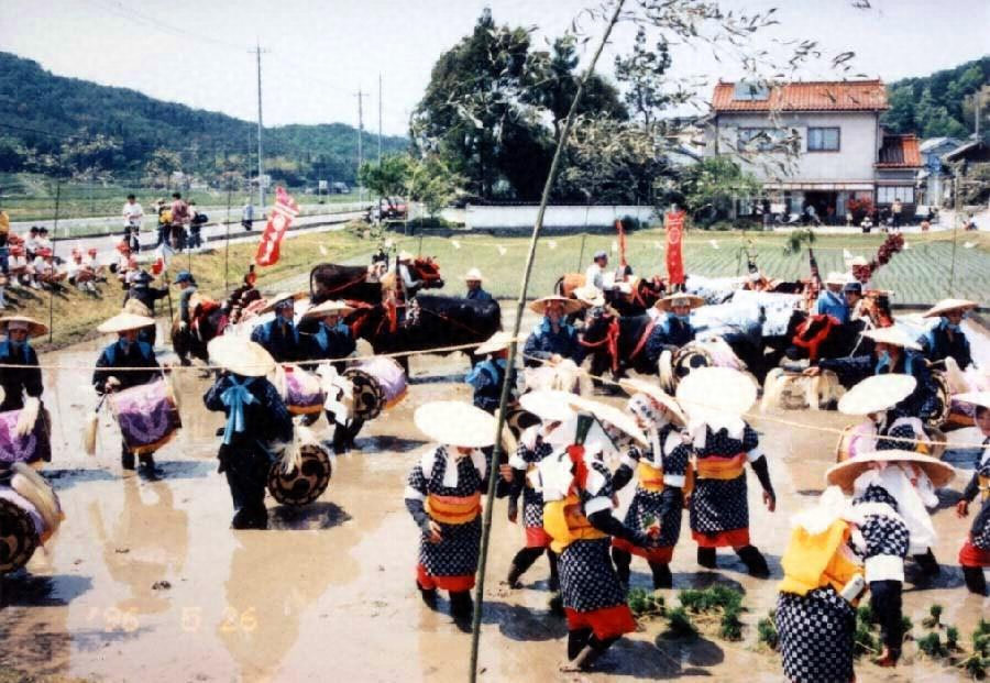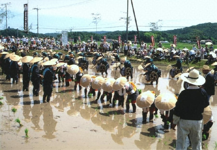 まず田植に先だって早乙女の田踊、牛馬の代掻などがあって、次いで歌大工(サンバイとも)の音頭にあわせて太鼓、笛、鉦などを囃し、多数の早乙女が歌大工と田植歌を問答風に掛け合わせてうたいつつ、苗を植え進む。
