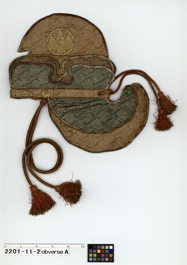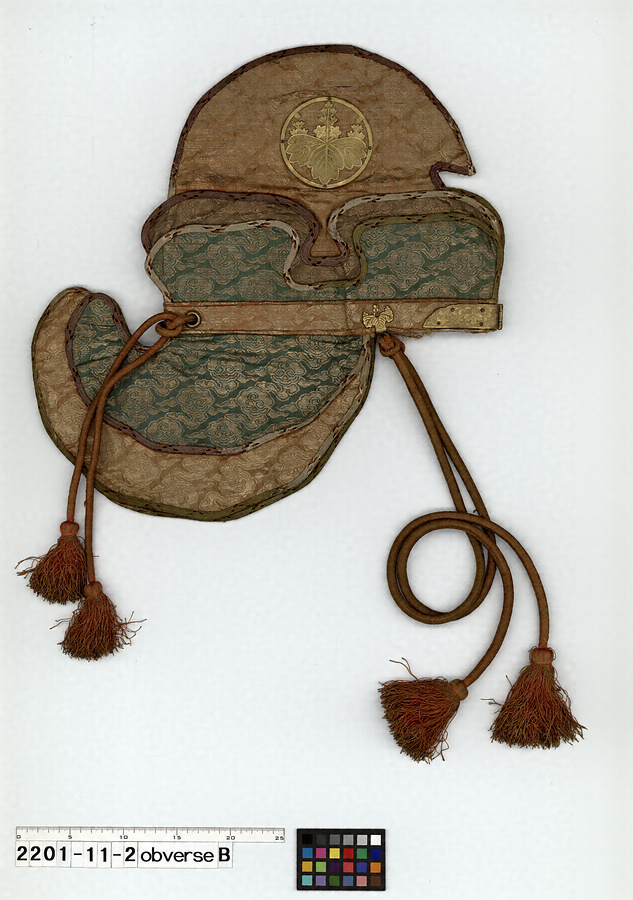 舞の常装束の鳥兜。平舞は数人が舞具を持たずに穏やかに舞う場合が多く「文の舞」とも呼ばれる。平舞では、舞楽面はつけずに常装束で行う場合が多く、袍・半臂・下襲・赤大口・表袴・紅単、忘緒・鳥兜・石帯・鳥兜・踏懸・襪・糸鞋が用いられる。装束の模様には菱・窠文・唐花・鳳凰などの有識模様*が多く、染織技法では同じく有識織物*に見られる錦・綾・浮織物・刺繍が多いことからも公家の染織文化が反映されている。