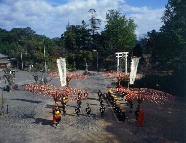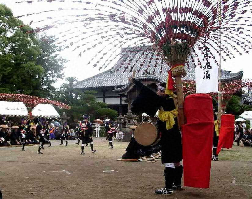 太鼓打ちの花輪が依代【よりしろ】として特徴のあるものであり、土地の老若男女が花輪の下を出入りして幸を願う風習があるなど、地方的特色のある風流の踊である。