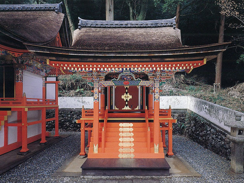 高倉神社は大谷山の裾野に鎮座する、記紀が記す東征に由来する逸話をもつ古社である。現在の各社殿はいずれも天正2年(1574)仁木長政が再建したもので、三社を別棟として中央殿(本殿)及び左殿(八幡社)を流造、右殿(春日社)を春日造とし、蟇股内の彫刻、手挟、頭貫の木鼻等に桃山時代の特色をよく残している。