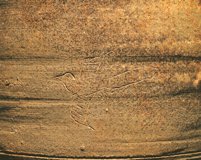 円筒形の陶製経筒の外容器で、底部には蓮華座を設けている。胎土は灰白色を呈し、焼成は堅緻で、蓋から身の上部にかけては浅緑色の自然釉が美しくかかっている。蓋は被せ蓋式の平蓋で、頂部は宝珠鈕をいただき、周囲には細い突帯をめぐらし、側面には耳状の紐を結ぶための鈕を、四方に付している。身はやや中部が膨み、口縁部には印籠(いんろう)蓋式の蓋受け部を作り、肩部にも結縛用の四耳を設けている。胴部には上中下の各部に、2重、3重、2重の箆描(へらがき)沈線をめぐらし、上部の正面には飛鳥文や花文を箆描きしている。蓮華座付の経筒や外筒は、銅製や石製品、中国製の青白磁経筒などに遺例がみられるが、陶製の外筒は極めて稀である。焼成地は愛知県の猿投(さなげ)窯で、12世紀初頭の焼成品とみられる。経塚遺物として貴重であるのみならず、日本の陶磁史上にも重要な位置を占めている。
