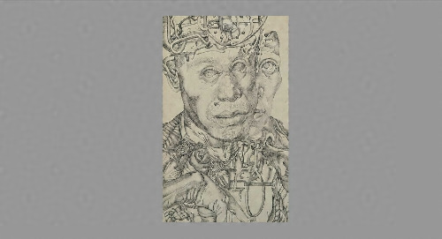 1907年、広島県山県郡に生まれた靉光は、本名を石村日郎(いしむらにちろう)といい、小さな頃から絵が大変得意な少年だったという。1923年に大阪の天彩画塾、翌24年には上京して太平洋画会研究所に学ぶ。この頃からの靉光の画友、寺田政明氏に、この作品を描いたのはメソ(面相筆)だと教えていただいた。しかし、この細密な線の密集を毛筆で描けるのか?よく研いだペンを使ったに違いないと言う意見も多く耳にした。そこで拡大鏡を使って覗いてみた。ペン先が引っかかったササクレはまったく見当たらない。線の上にも筆圧の痕跡がない。ペンでないのは間違いない。確かに寺田さんの教えてくださったとおりだったが、この小さな画面にこれだけの線を引く、線で描く、靉光の絵に対する執念と集中力を感じさせる作品だ。