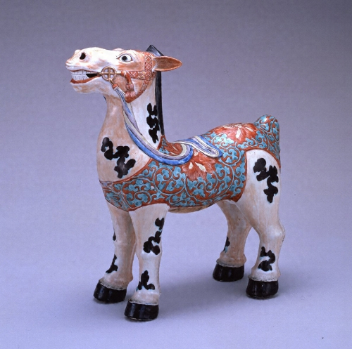 確固とした造形力から生まれたどっしりと安定感ある躯体、轡をはんで眼をかっと見開いた馬の緊張感ある表情、華麗な衣装の文様は作品の美しさを際立たせています。オランダ東インド会社を通じた注文に応えた有田の陶工の力量が発揮された名品といえるでしょう。現在のところ、世界で6体しか確認されていないうちの2体を当館でご覧いただけます。この作品はフランスからの里帰り品です。