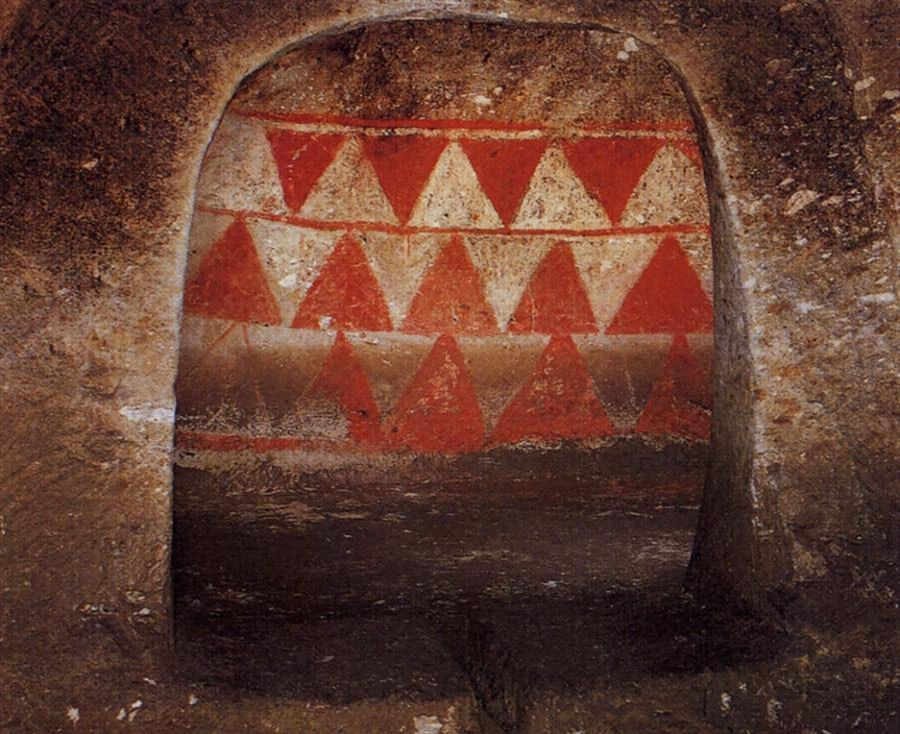 中田横穴は、夏井川河口の南約5キロにあり、太平洋岸に派生する砂質凝灰岩丘陵の北斜面に位置する。横穴は5基が三段に並列しているが、そのうち最下段の1号横穴は、複室形態の装飾壁画をもった横穴である。装飾は後室の三周壁に赤色と白色の三角連続文(一辺約40センチ)を基本形として三段に分けて描かれ、上段は逆正三角形、下二段は正三角形を配している。三角文の多くは、細い線刻で輪郭が施してあり、また赤色三角文は、白色顔料を下地として描かれている部分もある。後室前壁(羨門上部)でも、基本形は三角文であるが、赤色単彩で2本の弧状線の間に鋸歯状文が描かれている。なかでも稀有の例として注目されることは、床面の全体に赤色彩色が認められることである。内部施設は、羨道部に排水溝を設け、各羨門部には閉塞のための造作があるなど、横穴の形態をよく保っている。