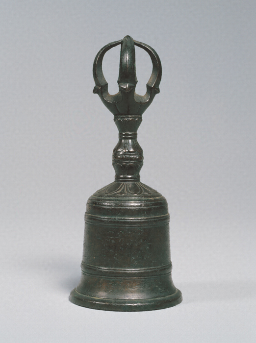 小ぶりの銅五鈷鈴(どうごこれい)。鈴身(れいしん)は裾広がりのベル形で、細みである。縁は一段高く作り、身の側面の上部と下部に子持ち紐帯をめぐらしている。肩口には一本の幅広の紐帯を陰刻している。鬼目(きもく)は横長二重圏で、突起は小さい。蓮弁帯は立体感に乏しく、主に線刻で細部を表現している。鈷(こ)は大人しい造形ながら端正な形を見せている。脇鈷(わきこ)に樋(ひ)を浅く線刻している。ベル風の鈴身の形、立体感の乏しい二重弁の蓮弁帯の表現、中鈷に連結する脇鈷の作り方などから製作年代を南北朝時代から室町時代に推定することができる。