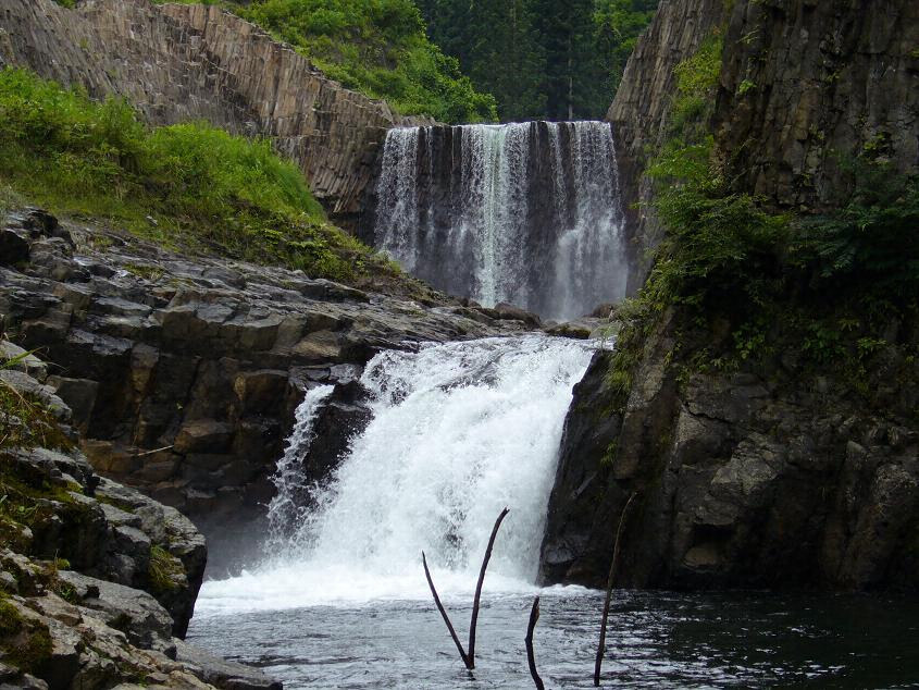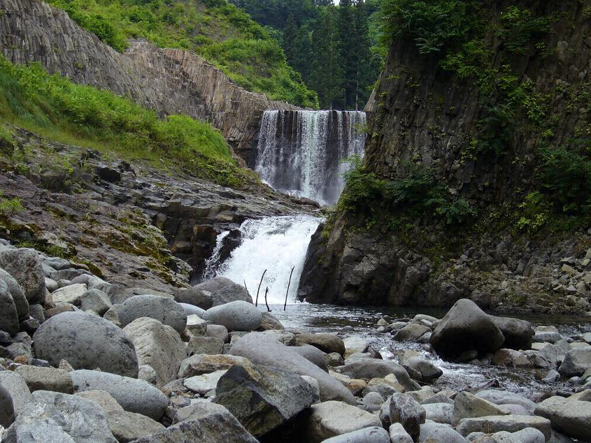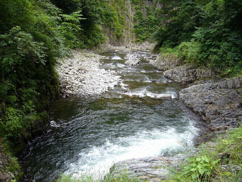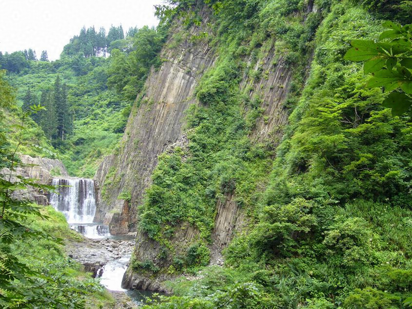 清津川ノ支流釡川ノ上流ニアリ古来越後七不思議ノ一トシテ著名ナルモノナリ釡川ノ清流ガ竪ニ柱状節理ヲナセル兩輝石安山岩ヲ穿チ瀑布急湍ヲナシツツ迂曲シテ峽谷ヲナセル間ニ數多ノ巨大ナル甌穴ヲ河床ニ残シタルモノニシテ河水ノ侵蝕ト岩石ノ構造トノ関係ヲ標式的ニ明示セリ溪間ハ濶葉樹ノ美林ニ蔽ハレ境地幽邃ナリ