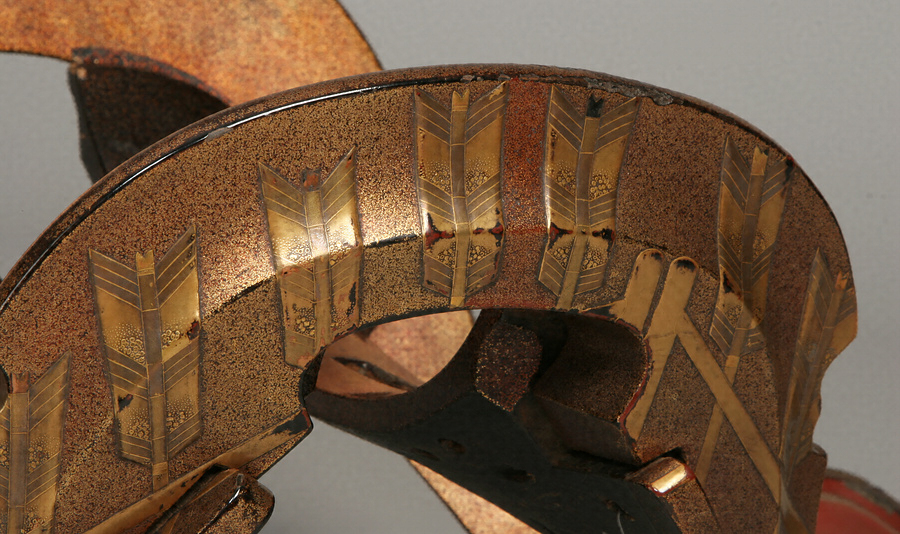 総体梨子地。鞍の前輪・後輪の表面には数本の矢羽を、金平蒔絵・高蒔絵、金切金、金貝などを用いて表わす。鐙の表は鞍と同文同技。但し胸の上部の梨子地は金粉の平目地様を呈し、中央部は錫粉の梨子地とするため、古作を後世に再加飾した可能性がある。踏み込みの内部は朱漆塗。居木裏面に黒漆書「文禄五年申卯月日(花押)」あり。