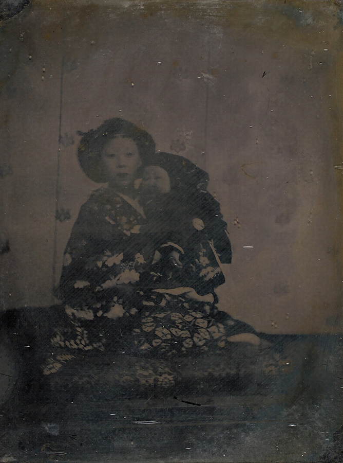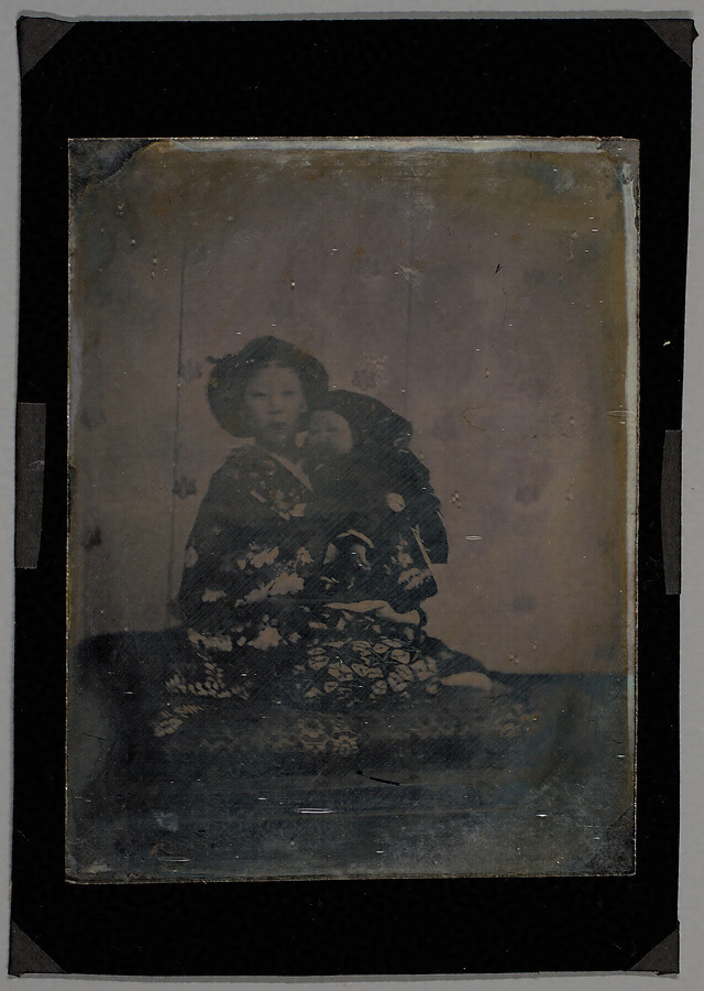 最後の佐賀藩主・鍋島直大の夫人胤子(1850~80)は、公家梅溪通善の娘で、初め駒(駒姫)、結婚後は胤子、諱は祚子という。元治元年(1864)12月24日、京都から佐賀城本丸に入り直大と挙式。明治3年(1870)6月23日、長女朗子を出産した。幼子を抱いて収まるこの写真はガラス湿板(アンブロタイプ)。明治3年撮影の直正の長女慈貞院(貢姫、健子)の肖像写真も、同じ座布団と桐紋散らしの屏風が背景にあることから、この写真も同年頃、佐賀で撮影されたのかと推測される。幕末・明治初期の写真がまだ一般的でない時期に、今風の母娘の記念写真は例の少ない貴重な資料といえる。撮影者は不詳ながら、安政6年(1859)、直正を撮影した川崎道民などが考えられる。