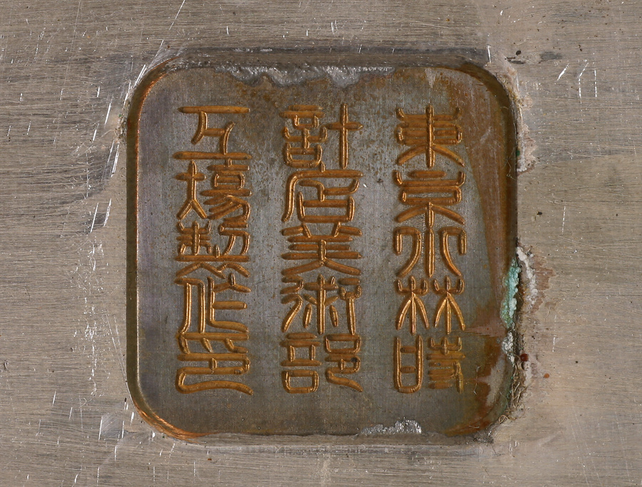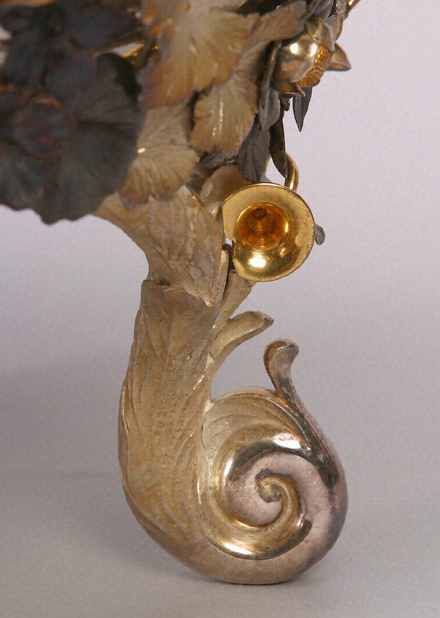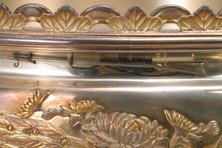 堂々たる形状の銀製花盛器。曲線的な把手や足には菊の葉をあしらい、胴部中央には菊花に鷹を、下方には満開の桜花を貼り付ける。さらに細部を見ていくと、頸部の銃、中央のサーベルやリボン、足元にあしらわれたラッパなどのモチーフがこの花盛器を特徴付けている。これは久邇宮朝彦親王の第八王子、朝香宮鳩彦王と明治天皇の第八皇女、允子内親王の結婚祝いとして明治43年(1910)5月に陸軍高等官一同から献上されたもの。鳩彦王は、この当時陸軍歩兵少尉を務めており、陸軍からの贈り物にふさわしい意匠であることが分かる。鳩彦・允子両殿下の第一王女紀久子は昭和6年に侯爵鍋島直映嗣子直泰へ降嫁している。
