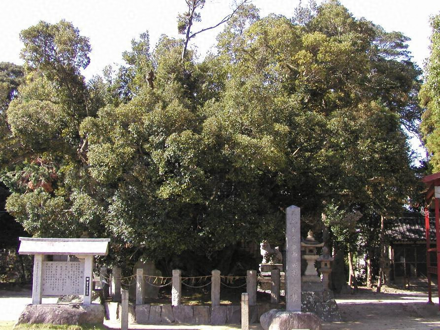 目通幹圍八メートル餘主幹ノ上部ハ朽チタルモ數本ノ太キ枝擴リ出テ欝蒼タル樹形ヲ成ス椎ノ巨樹トシテ有數ノモノナリ