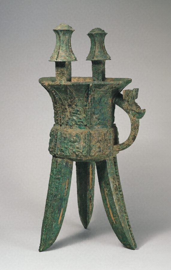中でも根津美術館の饕餮文方〓は左・中・右の三個一具の大器であり(高さ七二~七四センチ)、保存も完全に近い。これに対して白鶴美術館の二器は、大きさは前者の半分ないし四分一ほどの小器ではあるが、精緻なることこの上もなく、保存もまた完全である。また〓【か】・尊【そん】・〓【ほう】は二尺五寸ないし二尺に垂【なんな】んとする大器で、かつ、器の内底には同一の図形文字の鋳表わされている点で注目される。中国殷時代。