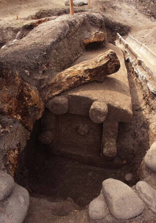 H10-07-069[[産土山古墳]うぶすなやまこふん].txt: 産土山古墳は、丹後半島の西海岸ほぼ中央、竹野川が日本海にそそぐ河口近くに位置する古墳時代中期の円墳である。昭和13年に長持形石棺が露出し、埴製枕に残る頭髪をはじめ、遺骸にそえられた様子がよくわかる形で豊かな副葬品が出土した。丹後地域における大型円墳の典型例であり、数少ない長持形石棺をもつ点でも貴重である。
